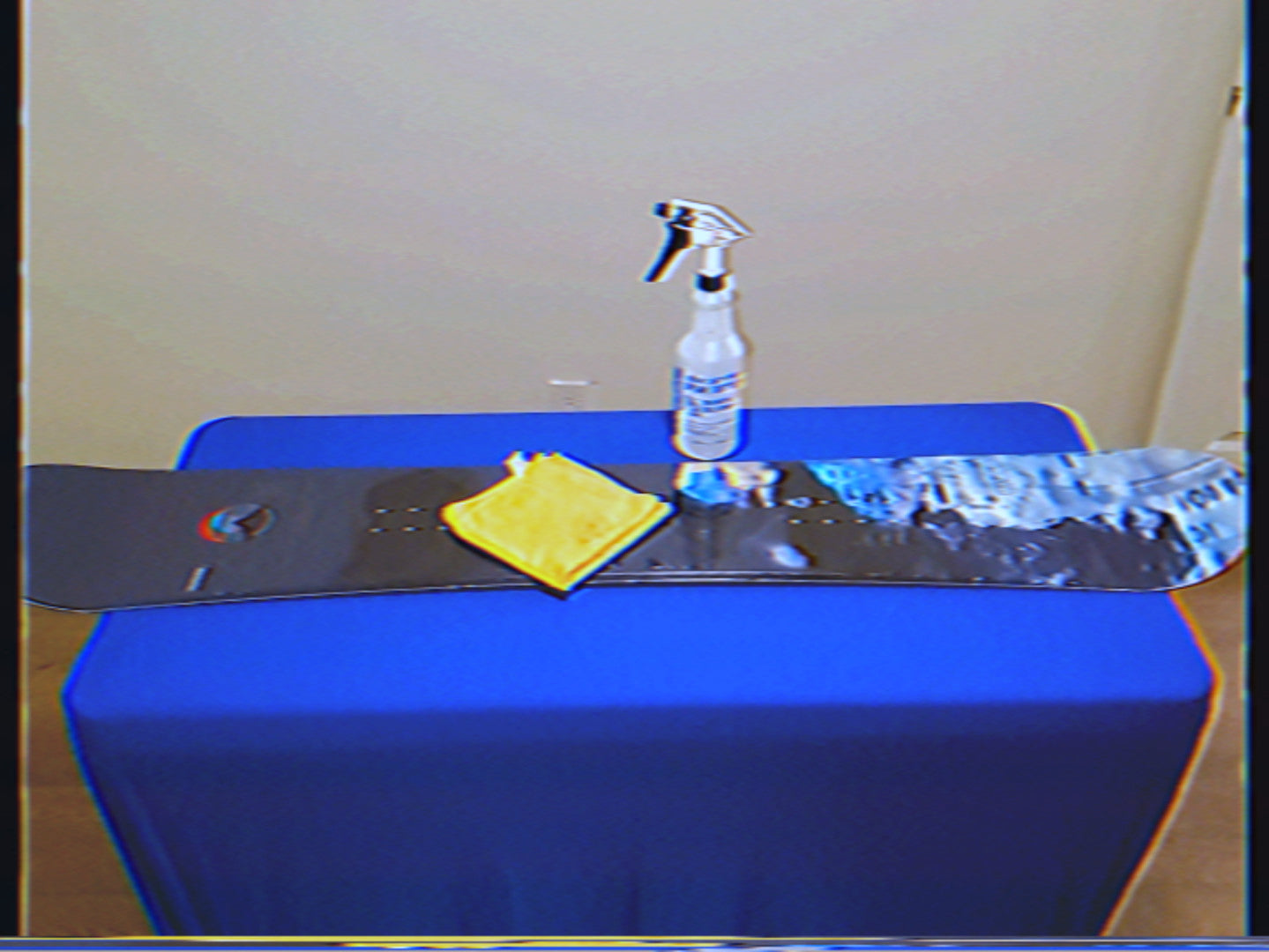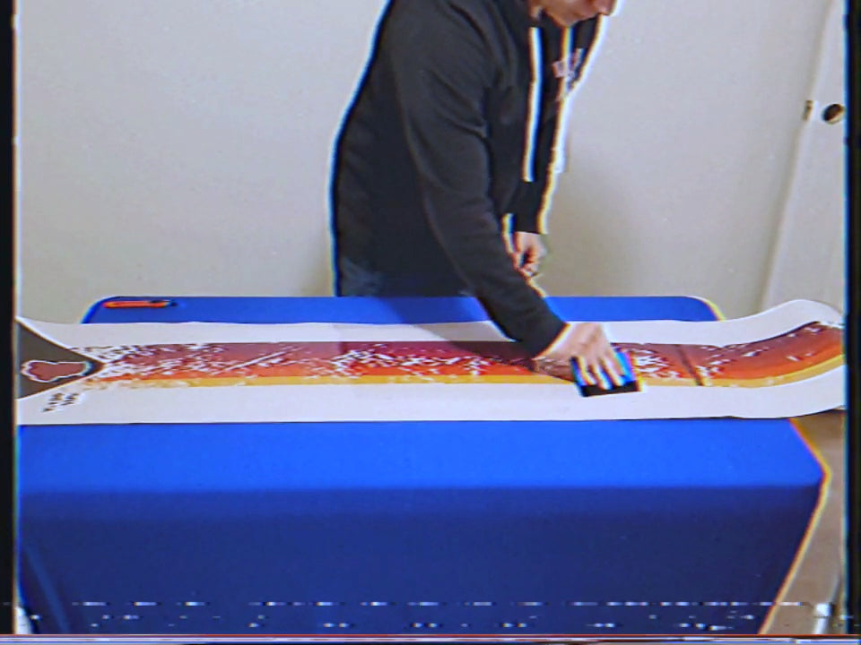 - Holding the edge of your wrap at a 45 degree angle, take your squeegee and push the vinyl from the center of the board all the way to the end,keeping tension on the vinyl and ample pressure throughout the stroke